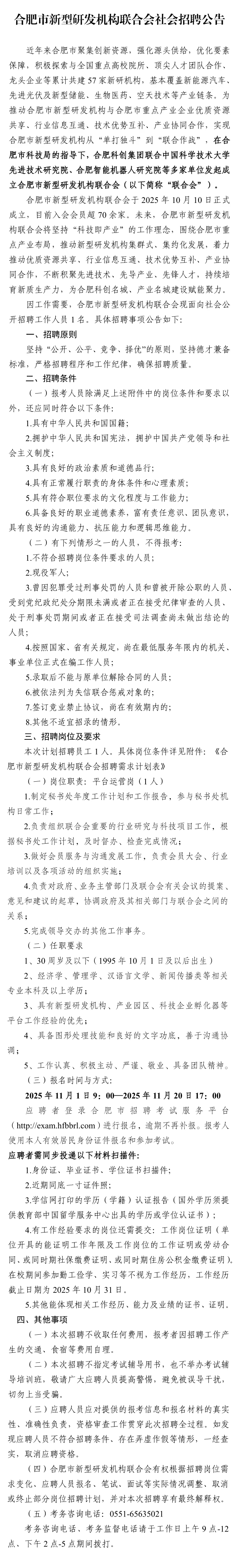 合肥市新型研发机构联合会社会招聘公告